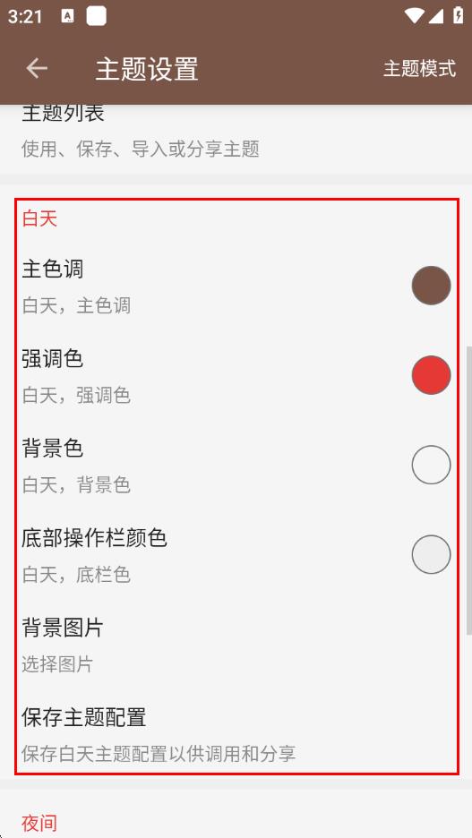 4、在主题设置页面下方,能看到白天和夜间主题设置区域,可设置主色调、强调色、背景色、底部操作栏颜色、背景图片等。