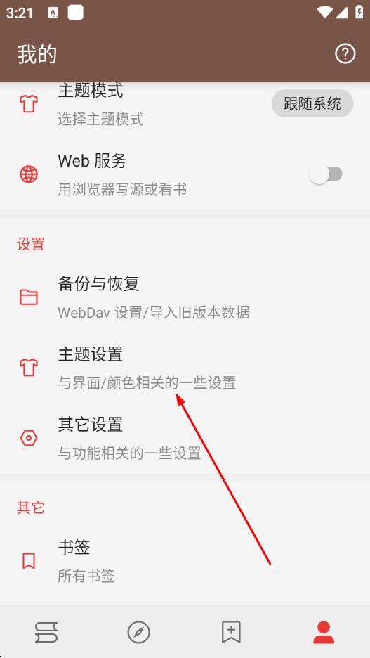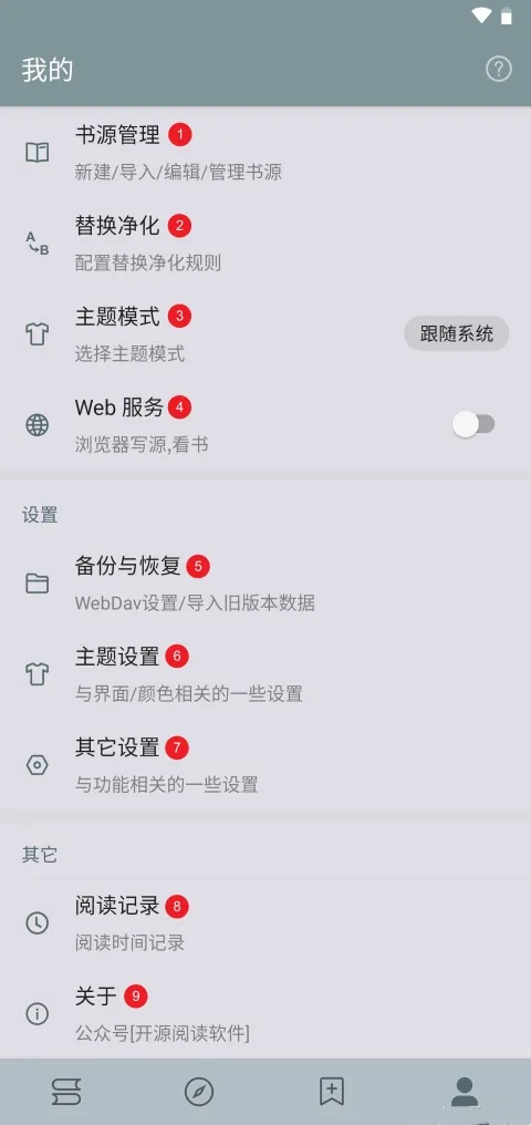 4、在我的这里可以进行书源的管理或者主题模式更改,还有书架中的书源进行备份或者恢复等。