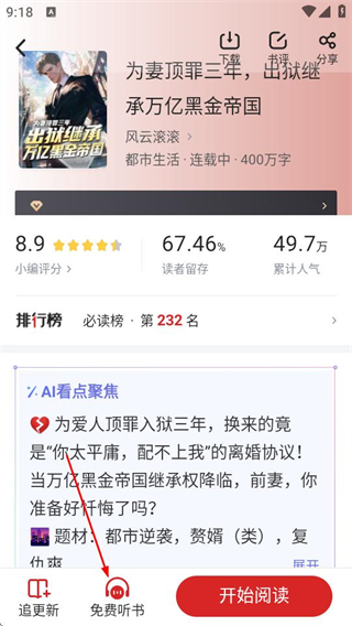 4、在小说详情页面,点击免费听书,即可使用听书功能收听本书。