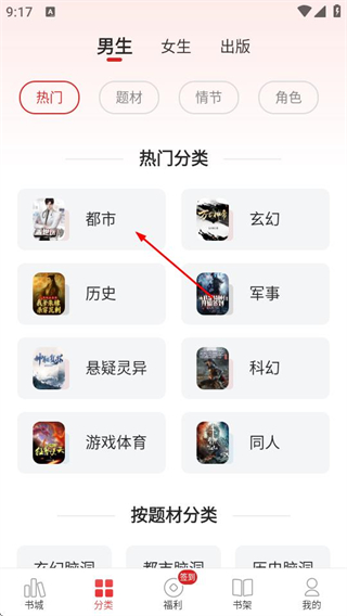 2、在分类页面,点击都市分类,进入都市类小说列表页面