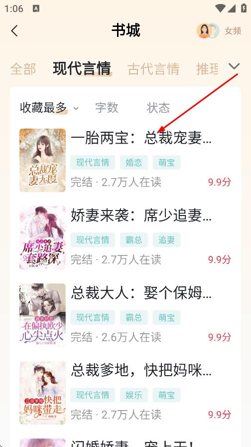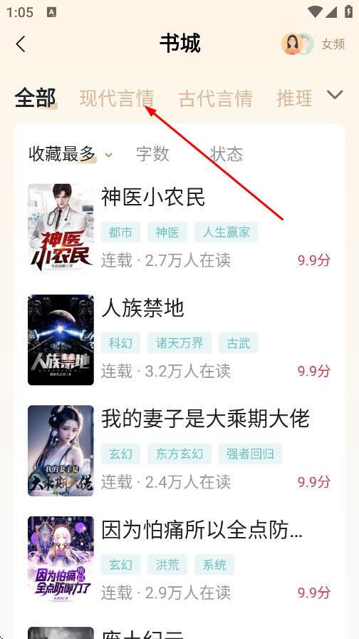 2、在书城页面,点击现代言情,切换到情小说列表。