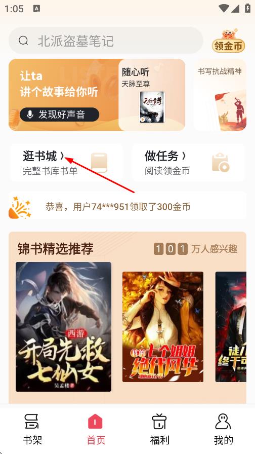 1、在首页,点击逛书城,随后即可进入书城页面。