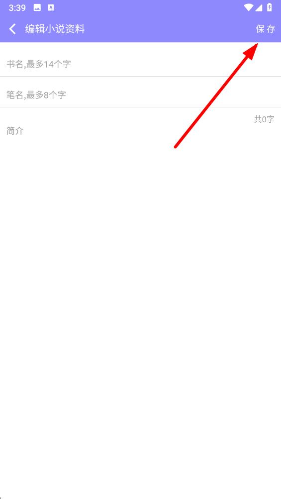 2、在编辑小说资料页面,输入书名、笔名、简介等信息后,点击右上角保存。