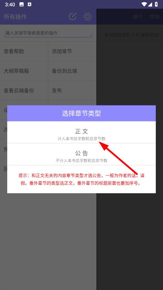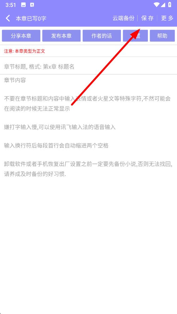 6、在新的页面输入章节标题和内容进行创作后点击右上角保存即可。