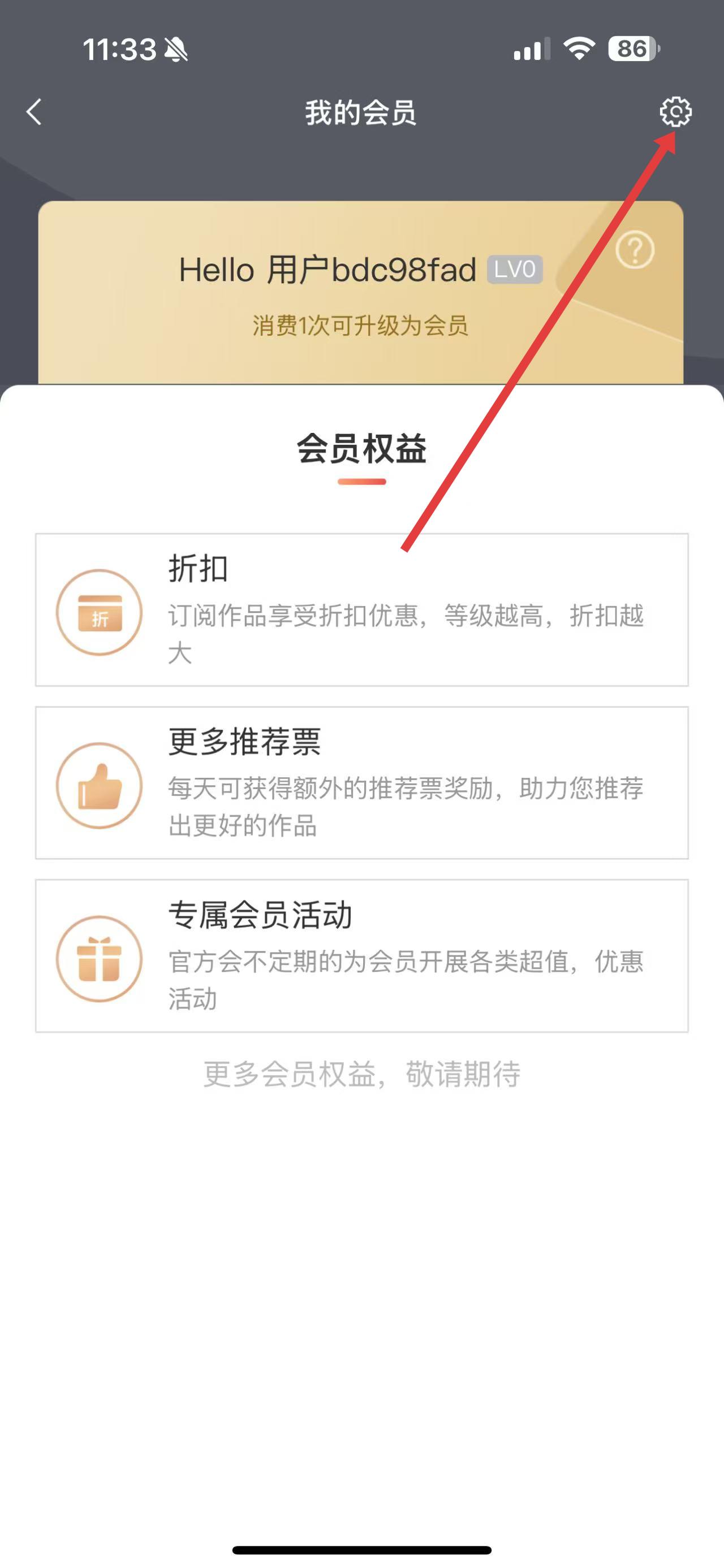 2、在我的会员界面,点击右上角的齿轮状设置图标,进入我的资料页面。