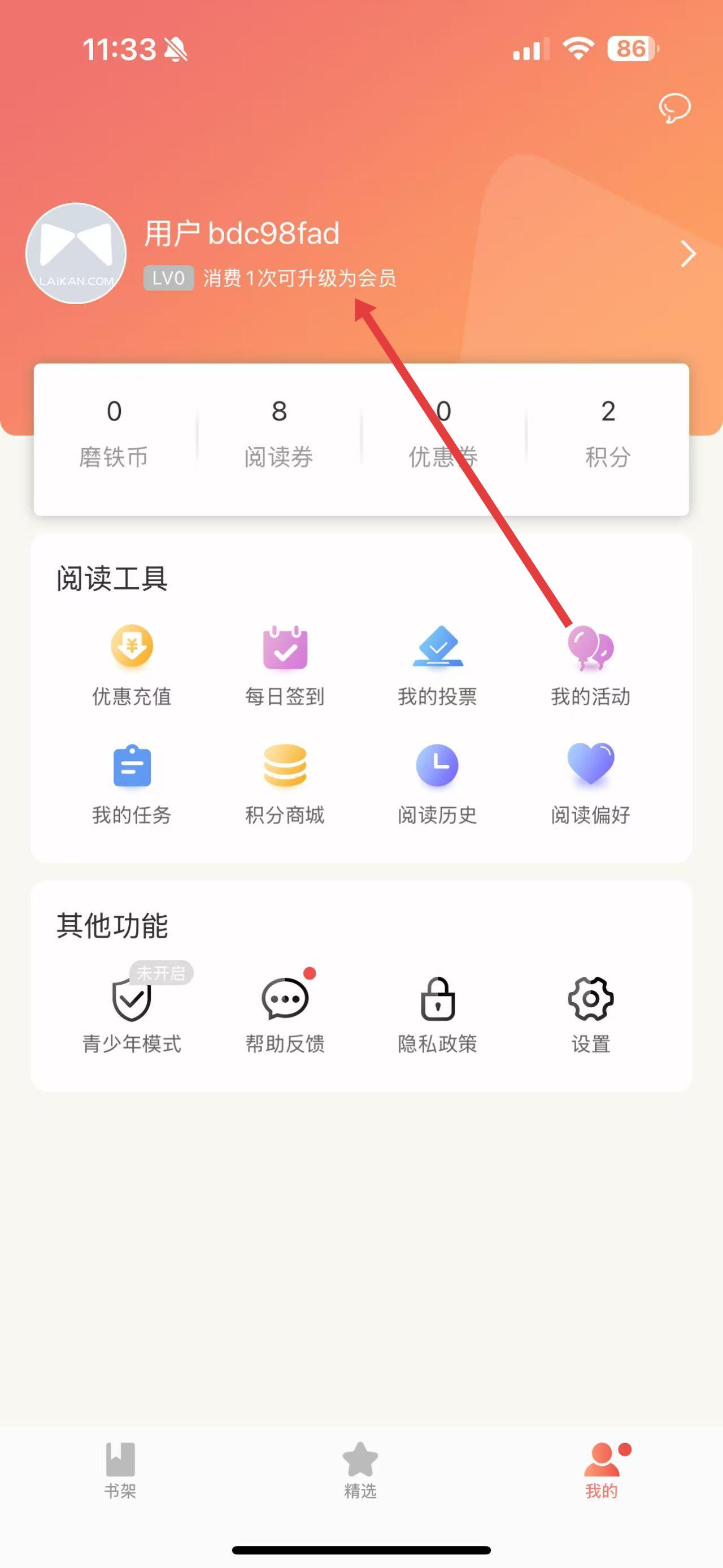 1、打开磨铁阅读App,点击底部导航栏中的我的,进入个人页面,点击头像右侧区域进入相关界面。