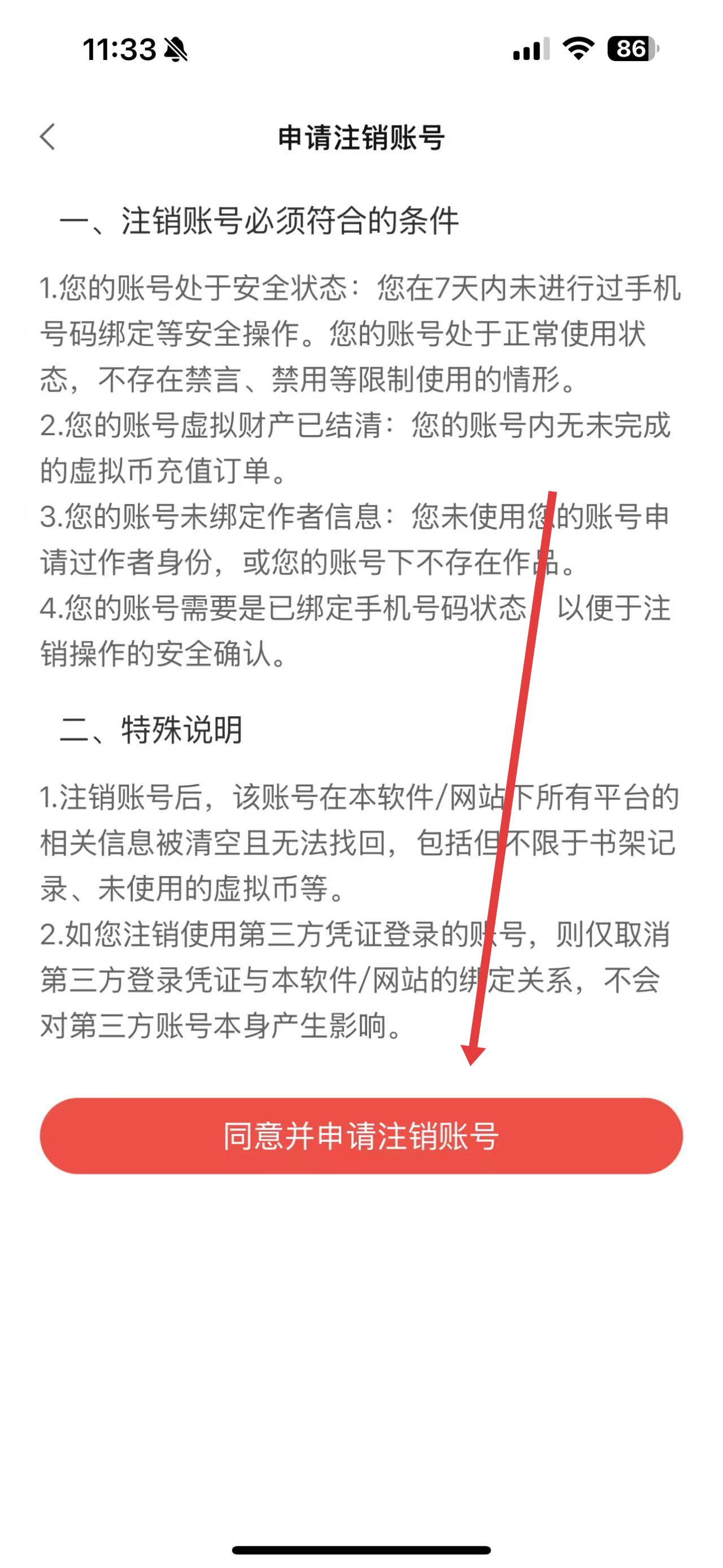 4、在账号安全相关操作界面中,找到申请注销账号的入口,阅读相关注销条件和说明后,点击同意并申请注销账号按钮,按提示完成注销操作。