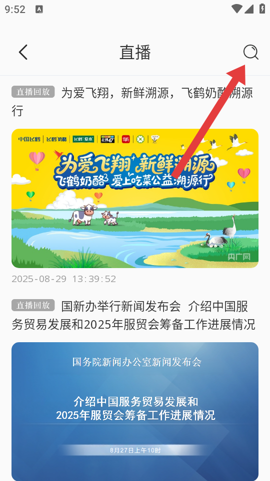 3、进入直播页面后,可以点击搜索图标查找特定直播,或直接浏览页面内的直播/直播回放列表。