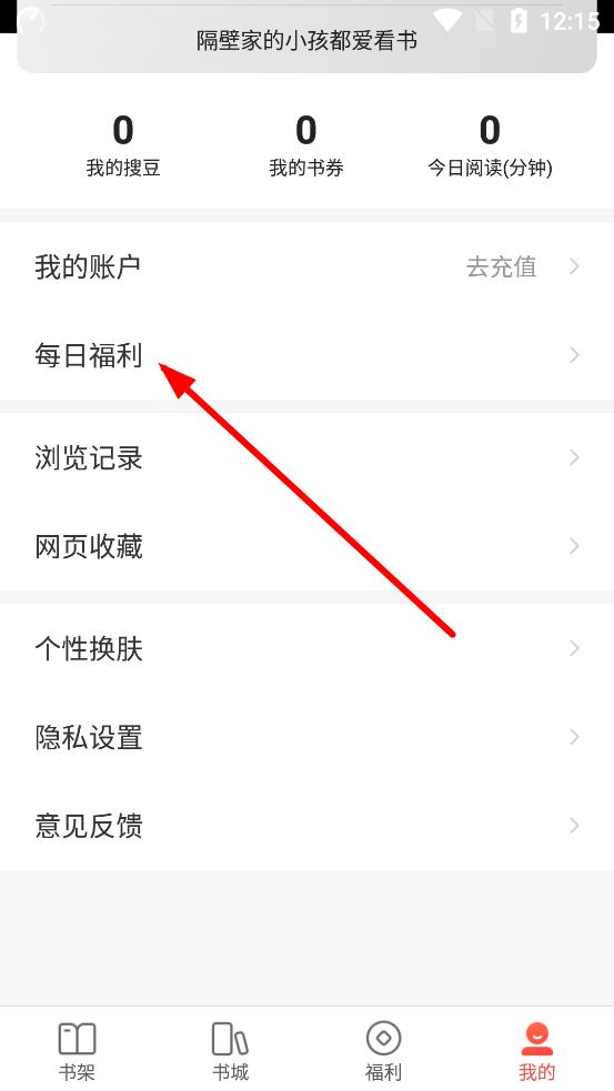 1、打开搜狗阅读APP,点击底部导航栏中我的进入个人中心页面,在页面中找到每日福利选项并点击进入。