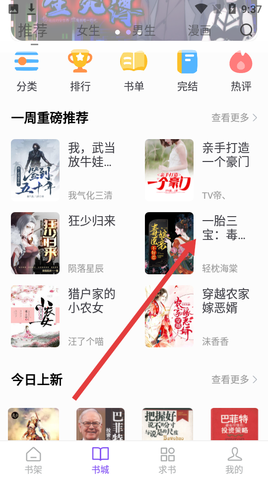 2、跳转到书城页之后,选择心仪的小说,点击封面进入小说详情页。