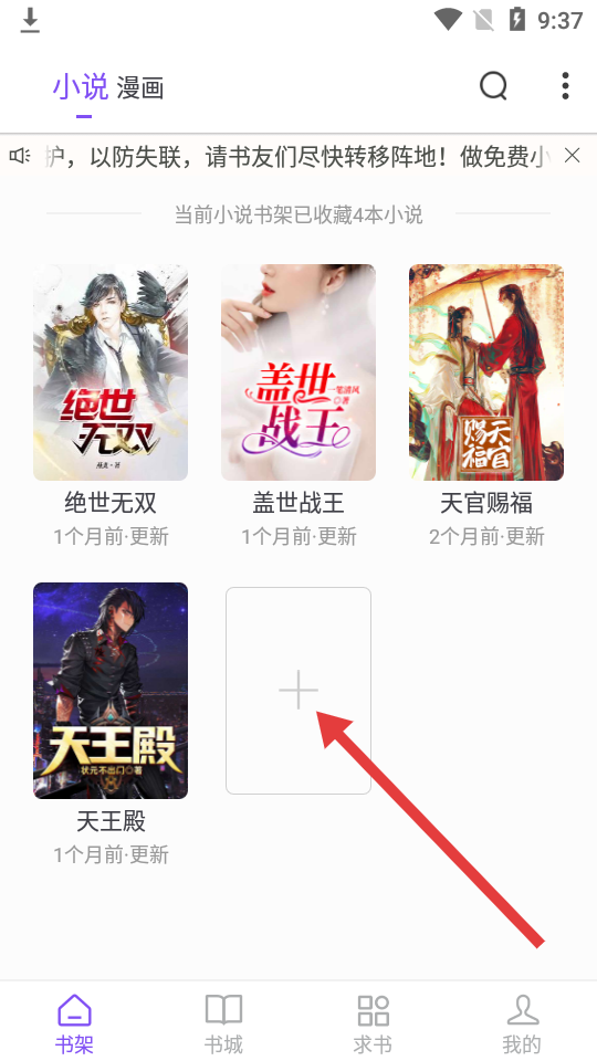 1、在书架页点击加号按钮,可以添加新的小说到我的书架。