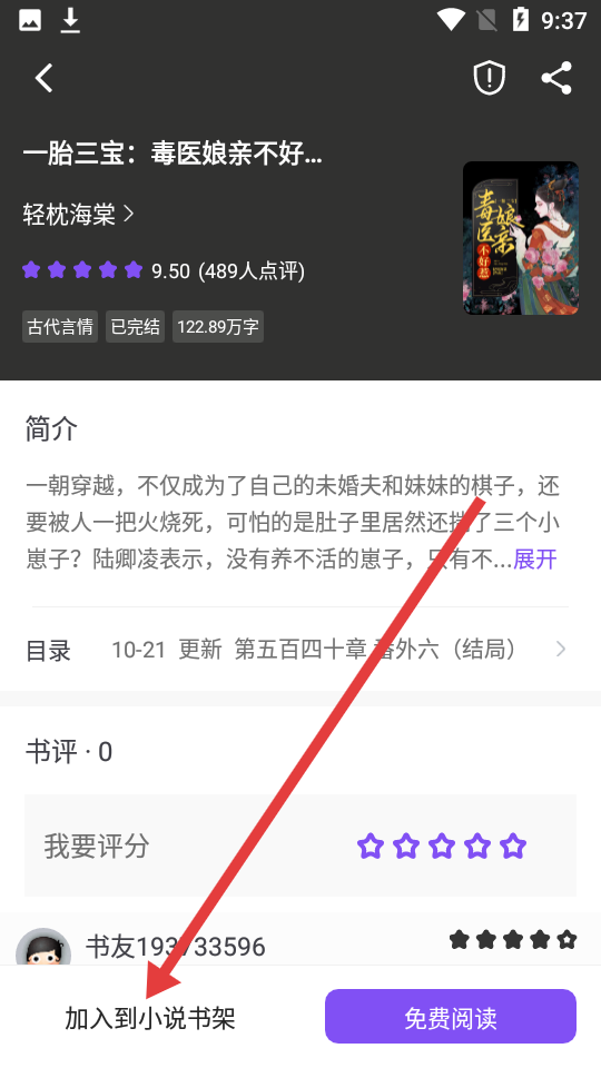 3、在小说详情页面,找到左下角的加入到小说书架按键,点击完成添加小说操作。