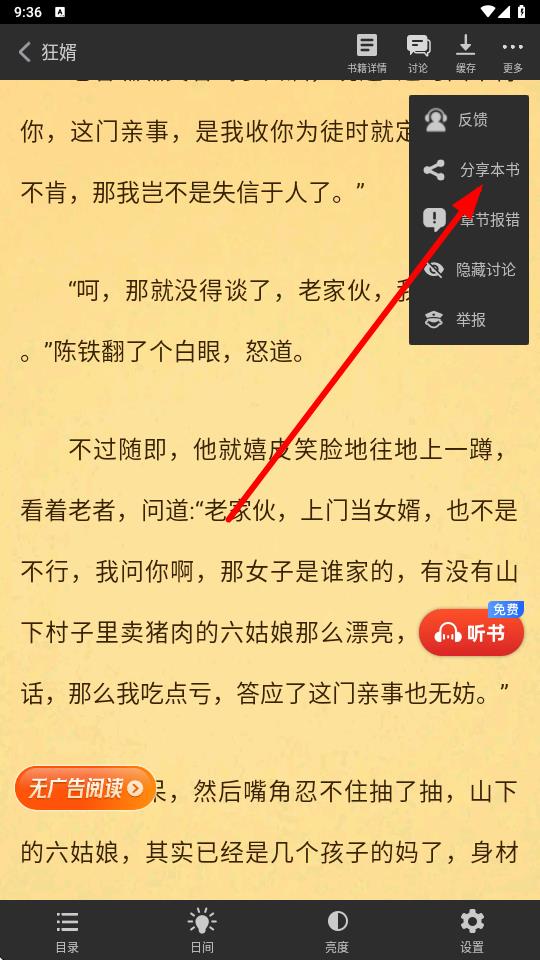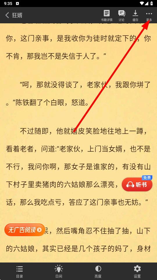 1、打开追书神器,进入想分享书籍的阅读界面,点击右上角更多,展开功能菜单。