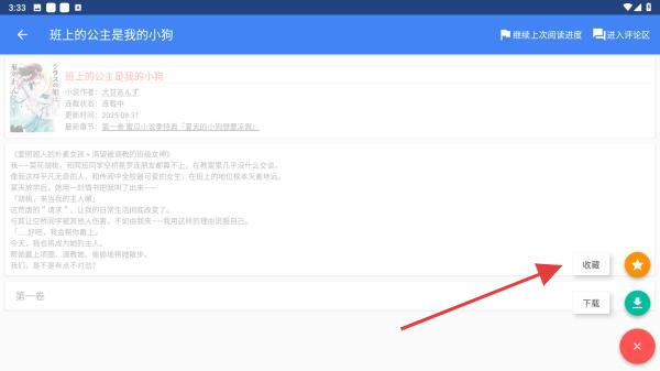 3、点击后会弹出收藏、下载选项,点击收藏的按钮,即可将小说加入收藏夹。