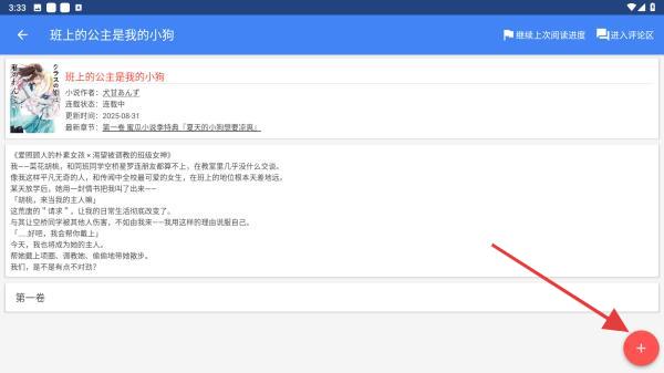 2、在小说详情页右下角,用户需点击红色+号的功能按钮。