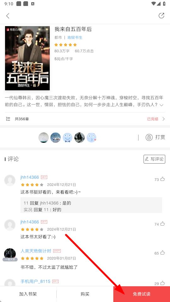 1、进入小说详情页,点击免费试读开始阅读。