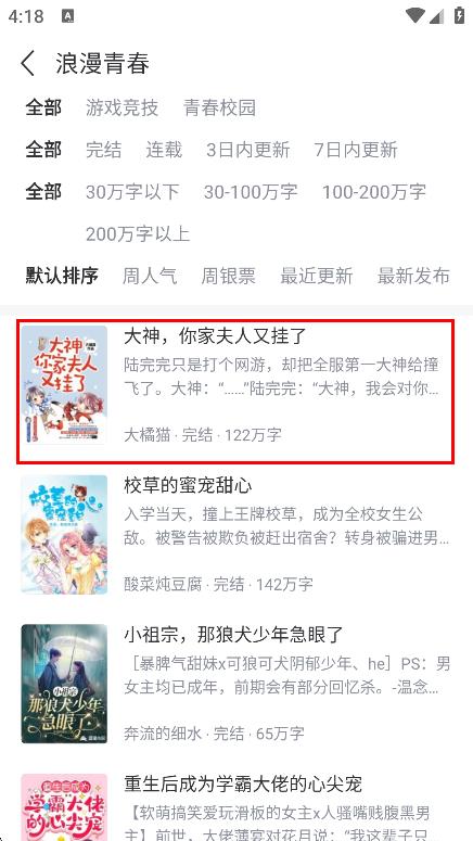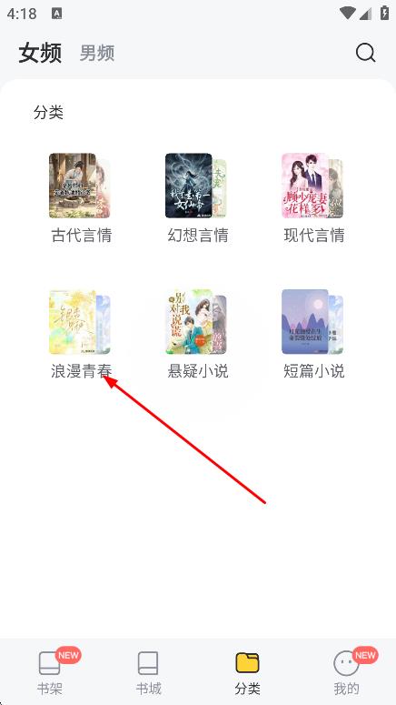 1、在分类页面,点击浪漫青春分类,进入浪漫青春小说列表。