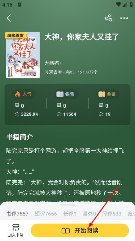 3、在小说详情页面,点击开始阅读,进入小说阅读页面。