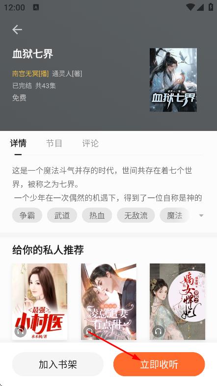 3、在作品详情页面,点击立即收听,开始收听作品。