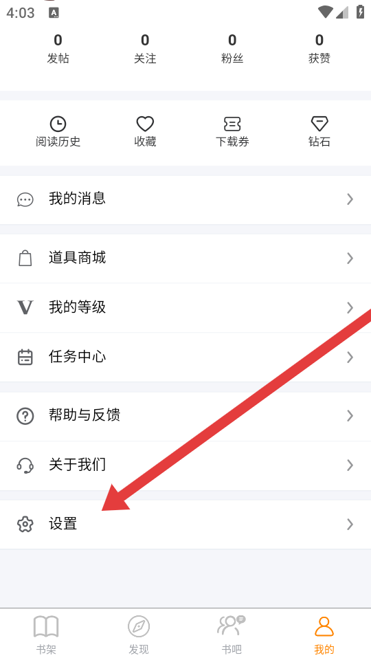 1、打开八戒阅读器,点击底部我的,进入个人页面后找到设置选项并点击。