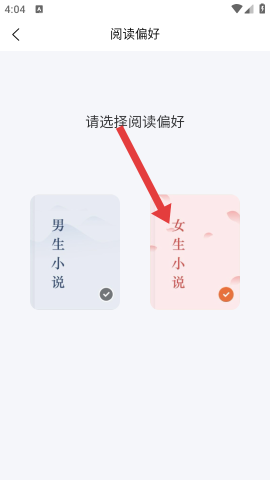 3、在阅读偏好界面,根据自身喜好如女生小说、男生小说等类型进行勾选,即可完成阅读偏好模式的设置。