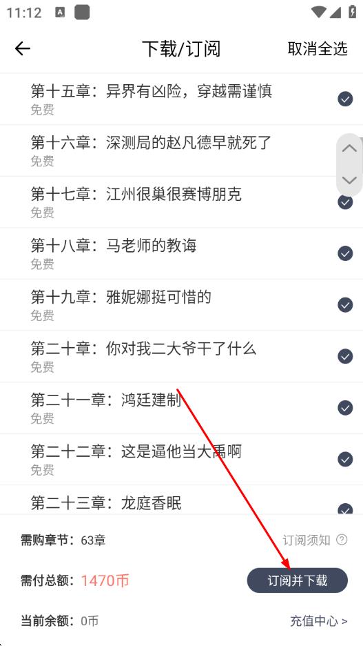 4、勾选完章节后,点击订阅并下载,即可完成小说章节的下载。