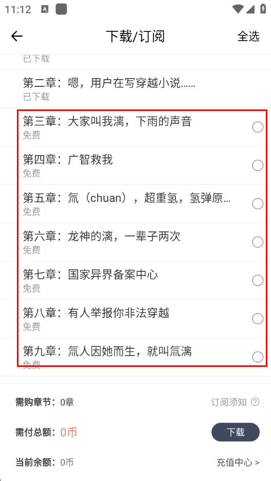 3、在下载/订阅页面,勾选想要下载的小说章节。