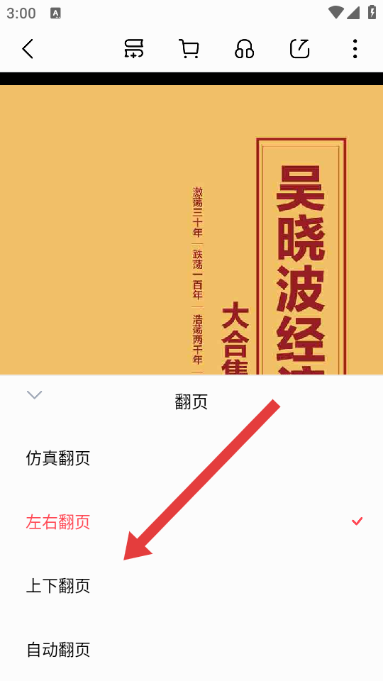 3、在翻页方式列表里,选择上下翻页,设置完成后返回阅读界面,上下滑动屏幕即可实现上下翻页阅读。