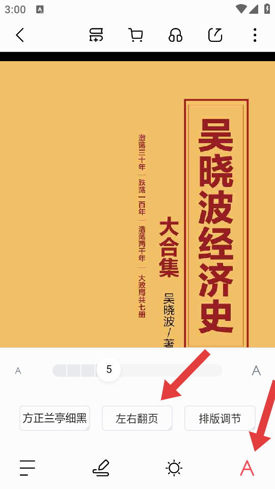 2、在书籍阅读界面点击中间区域,调出设置选项点击右下角的A形图标,接着再点击左右翻页的选项。