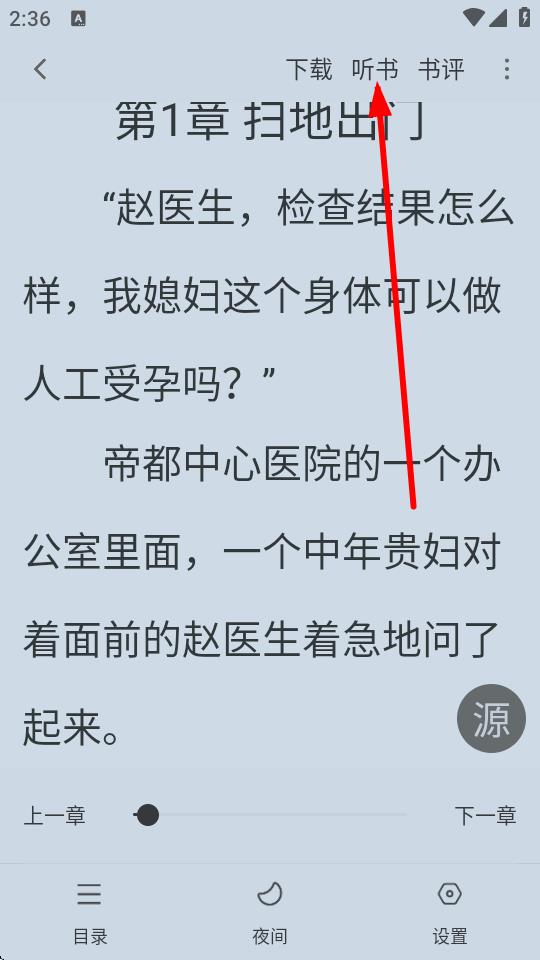 3、在小说阅读界面中,点击屏幕上方的听书选项。