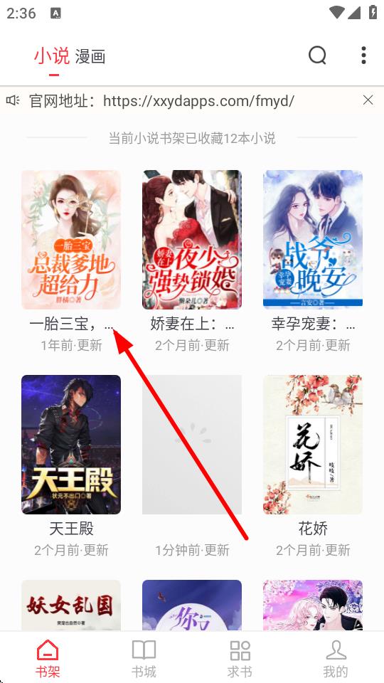 1、打开肥猫阅读app,在书架页面中,点击想要听书的小说,比如一胎三宝,总裁爹地超给力。