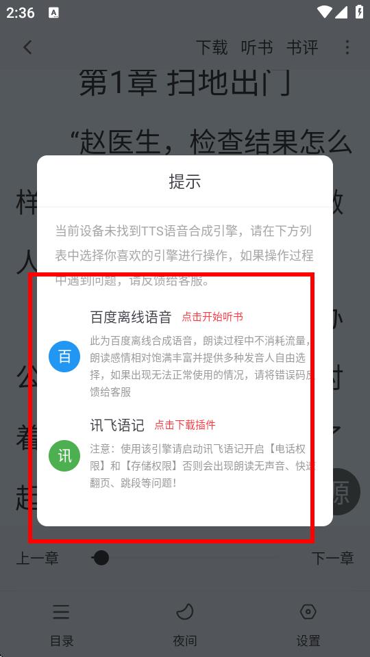 4、若当前设备未找到TTS语音合成引擎,会弹出提示框,在提示框中选择喜欢的语音引擎,点击下载插件后使用,即可开启听书模式。