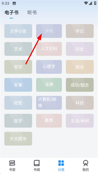 2、在分类页面,点击少儿分类,进入少儿类电子书列表页面。
