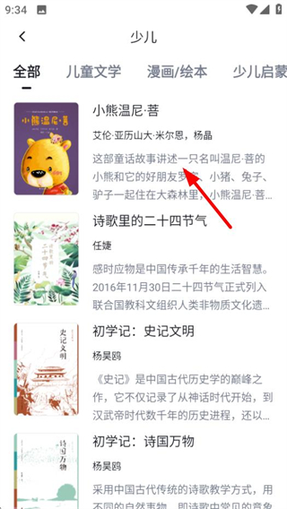 3、在少儿类电子书列表中,选择目标书籍,进入该书详情页面。