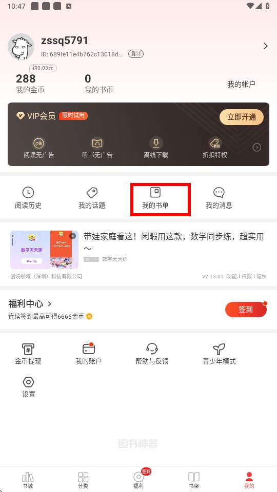 2、在个人页面中找到我的书单选项并点击进入。