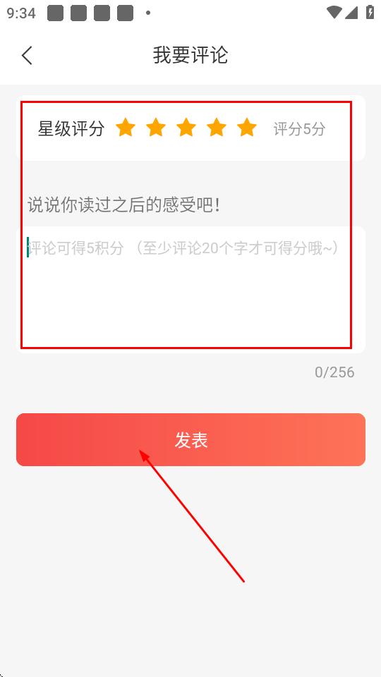 3、在我要评论页面,进行星级评分,在下方文本框输入对书籍的评价内容,点击发布。