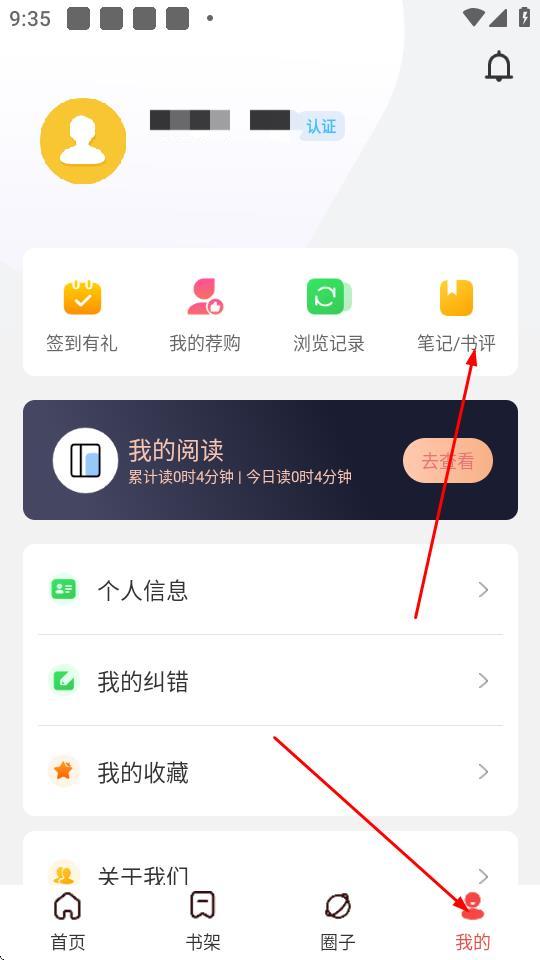 4、发表成功后,进入我的,再点击笔记/书评选项。