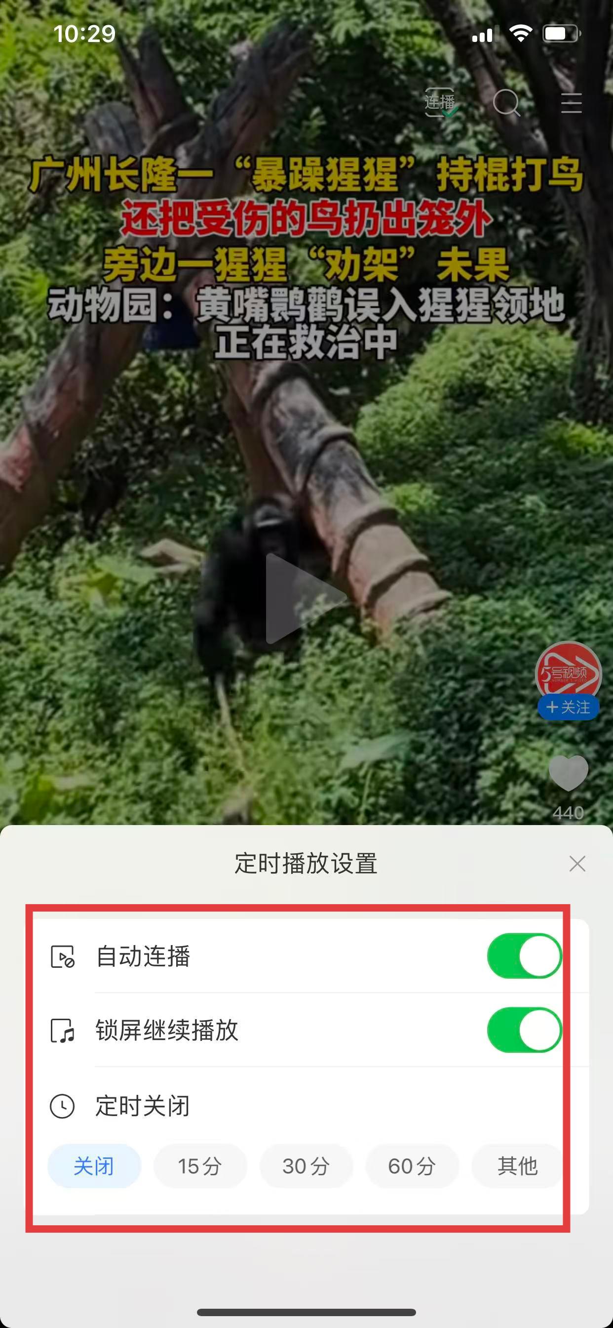 3、点击后会弹出定时播放设置弹窗,将自动连播后的开关按钮开启,即可设置成功,还能设置锁屏播放等。