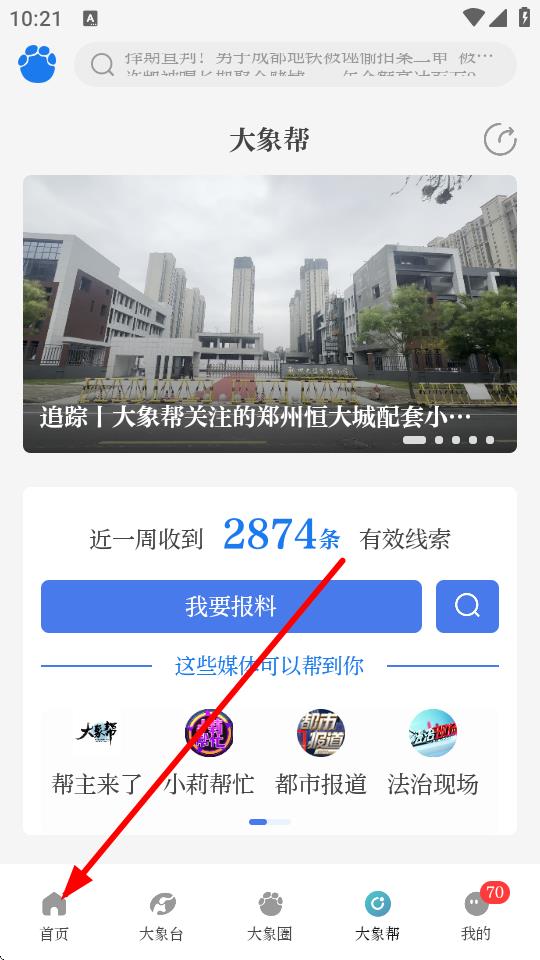 1、打开大象新闻App,点击底部导航栏中的首页选项,进入首页界面。
