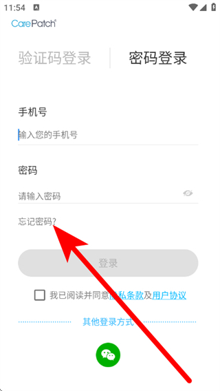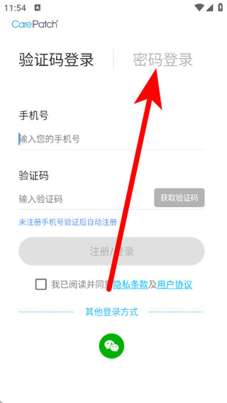 1、在验证码登录页面,点击密码登录,进入密码登录页面。