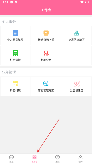 1、打开护理助手APP,进入工作台页面,可处理个人事务,如个人档案填写、敏感指标上报等,也能进行业务管理,像科室排班等,开启护理工作流程。