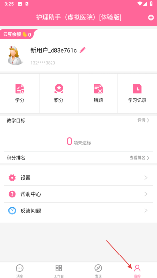 3、进入我的页面,查看学分、积分、错题、学习记录等信息,管理教学目标、积分排名,使用设置、帮助中心、反馈问题功能,优化使用体验。