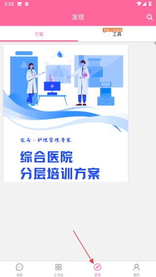 2、切换至发现页面,浏览综合医院分层培训方案等内容,了解护理管理专家提供的方案工具,获取专业知识与培训资源,助力护理技能提升。