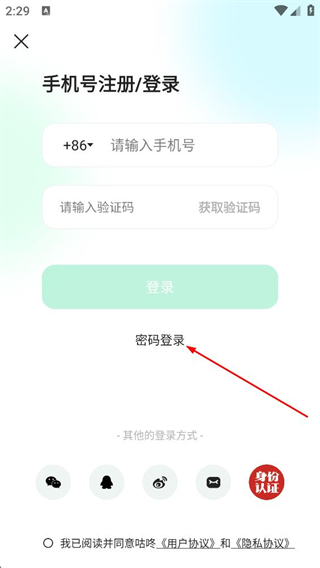 2、随后可以在登录选择页面,点击密码登录,切换到密码登录界面。