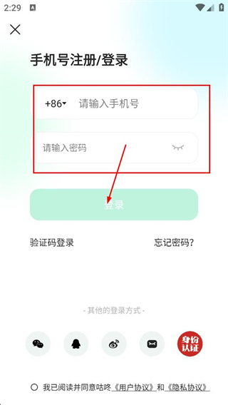 3、在密码登录界面,输入手机号、密码,点击登录,完成登录操作。
