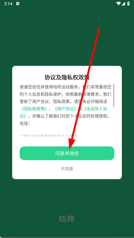 1、打开咕咚APP,在弹窗中点击同意并继续。