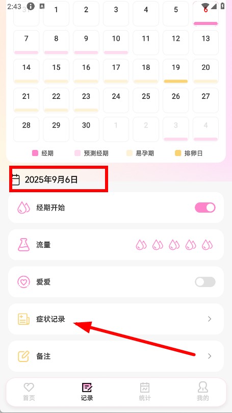 4、在添加症状记录页面,选择颜色和经期症状,然后点击完成添加。