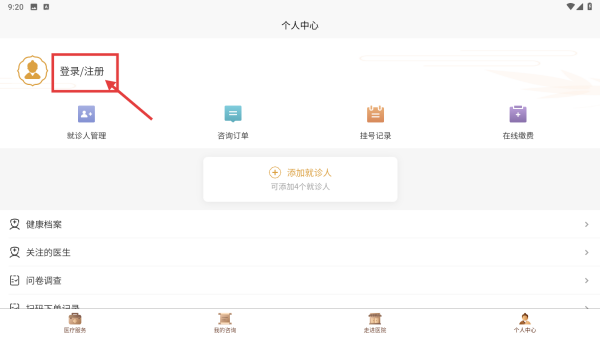 2、在个人中心,点击登录/注册区域,进入登录注册选择界面。