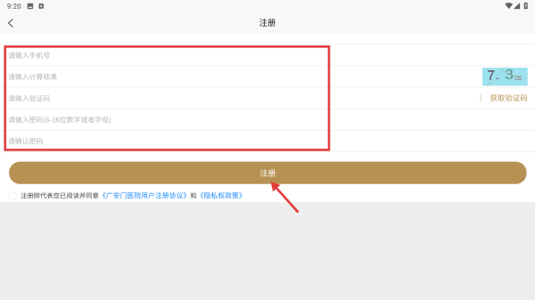 4、输入手机号、计算结果、验证码、密码等信息,勾选协议后点击注册按钮,完成账号注册。