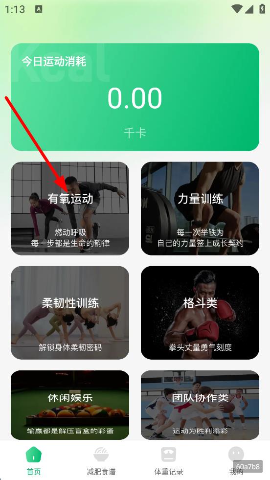 1、在首页,点击有氧运动,进入有氧运动选择页面。